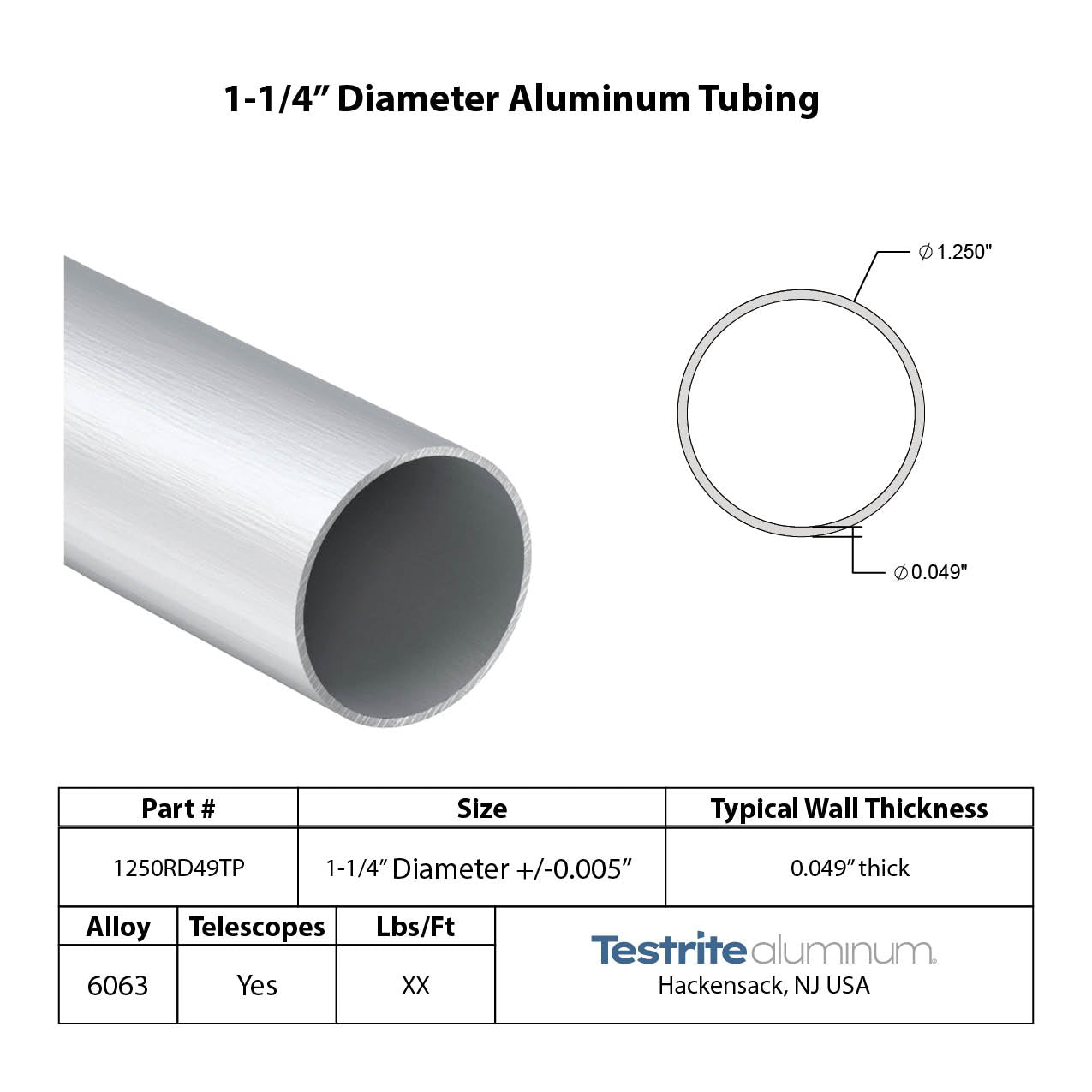 Our 1-1/4" OD x .049" Wall Round telescopic aluminum tube is a 1.25" Diameter aluminum pole with a heavier wall. While this 1.25" OD tube has the .049" wall, it is still a tight tolerance tube, drawn, enabling it work well in a variety of applications including telescoping aluminum tubing and bending aluminum tubing. is This drawn aluminum tubing is consistent in both wall thickness and ovality.