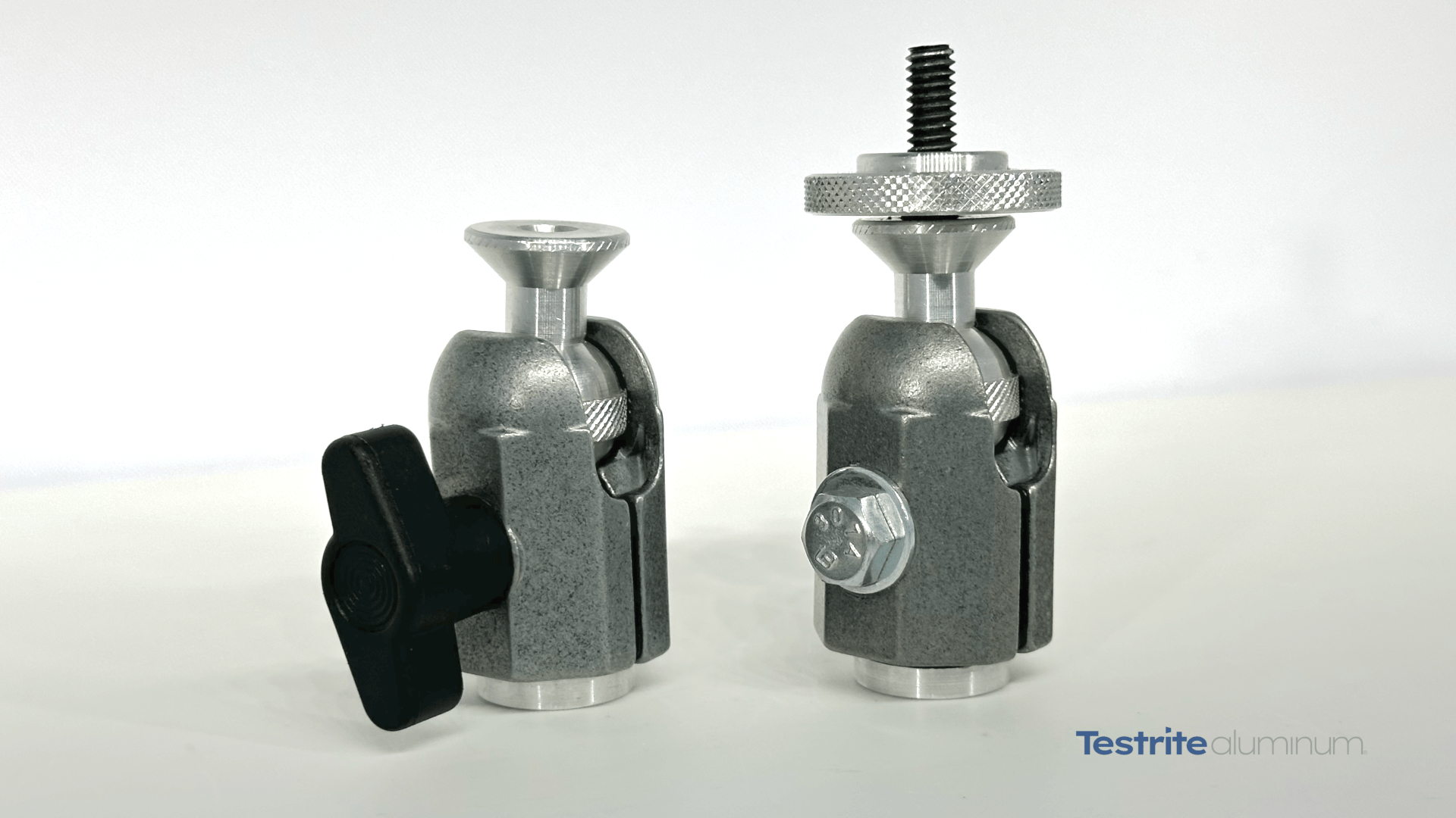 Note that while our standard ball swivel comes with a knob, the knob can be replaced with a hex head bolt for MUCH stronger holding power, important in applications where being able to "lock" the ball swivel into position is key and having to use a wrench is a non-issue. Note the version sold on TestriteAluminum.com comes with the knob, but in quantity we can quote with the hex head bolt, or you can replace it manually.